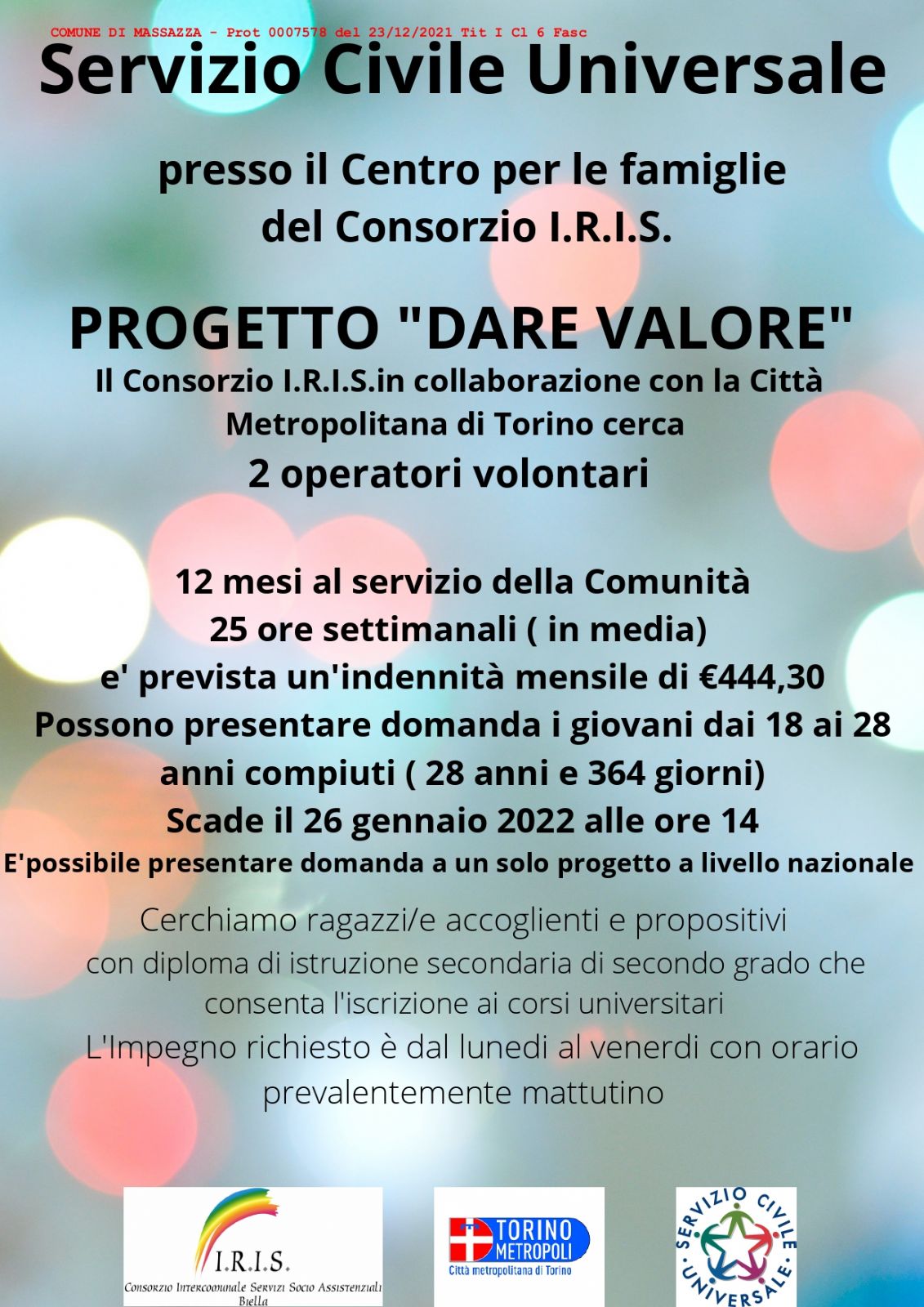 E' stato pubblicato il nuovo bando per il Servizio Civile Universale e il Consorzio I.R.I.S., (in qualità di Ente di Accoglienza della Città Metropolitana di Torino) cerca due operatori volontari/e da avviare nel Progetto " Dare Valore" presso il Centro per le famiglie di Via Caraccio n.4 ( di cui un giovane con minori opportunità - difficoltà economiche).