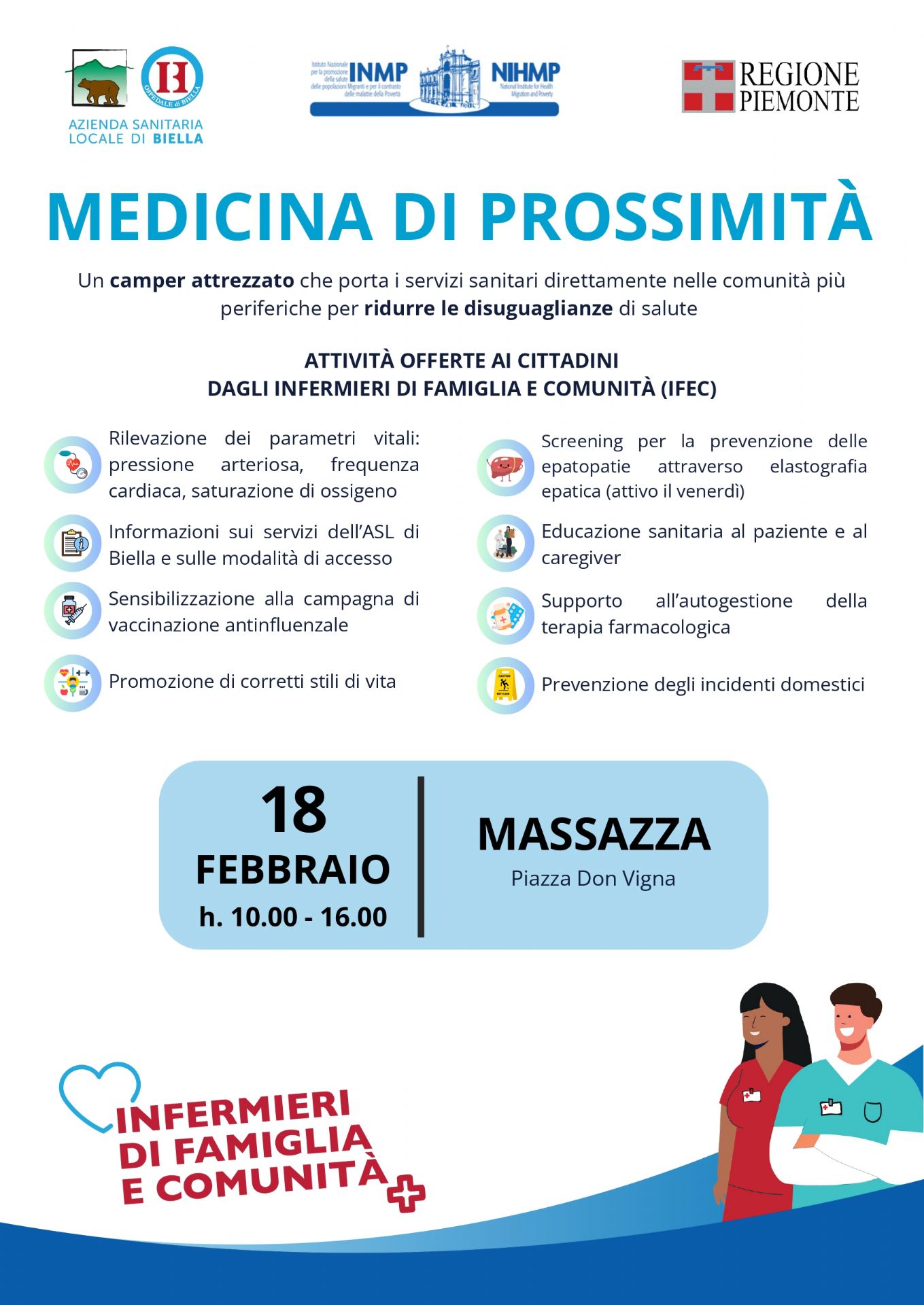 Nell'ambito del Progetto Camper "Cure primarie e territorio: l’Infermiere di Famiglia e Comunità (IFeC) e la medicina di prossimità nell’ASL di Biella”, il Comune di Massazza promuove e organizza l’arrivo di un camper sanitario, che porta i servizi sanitari direttamente nelle comunità per ridurre le disuguaglianze di salute.