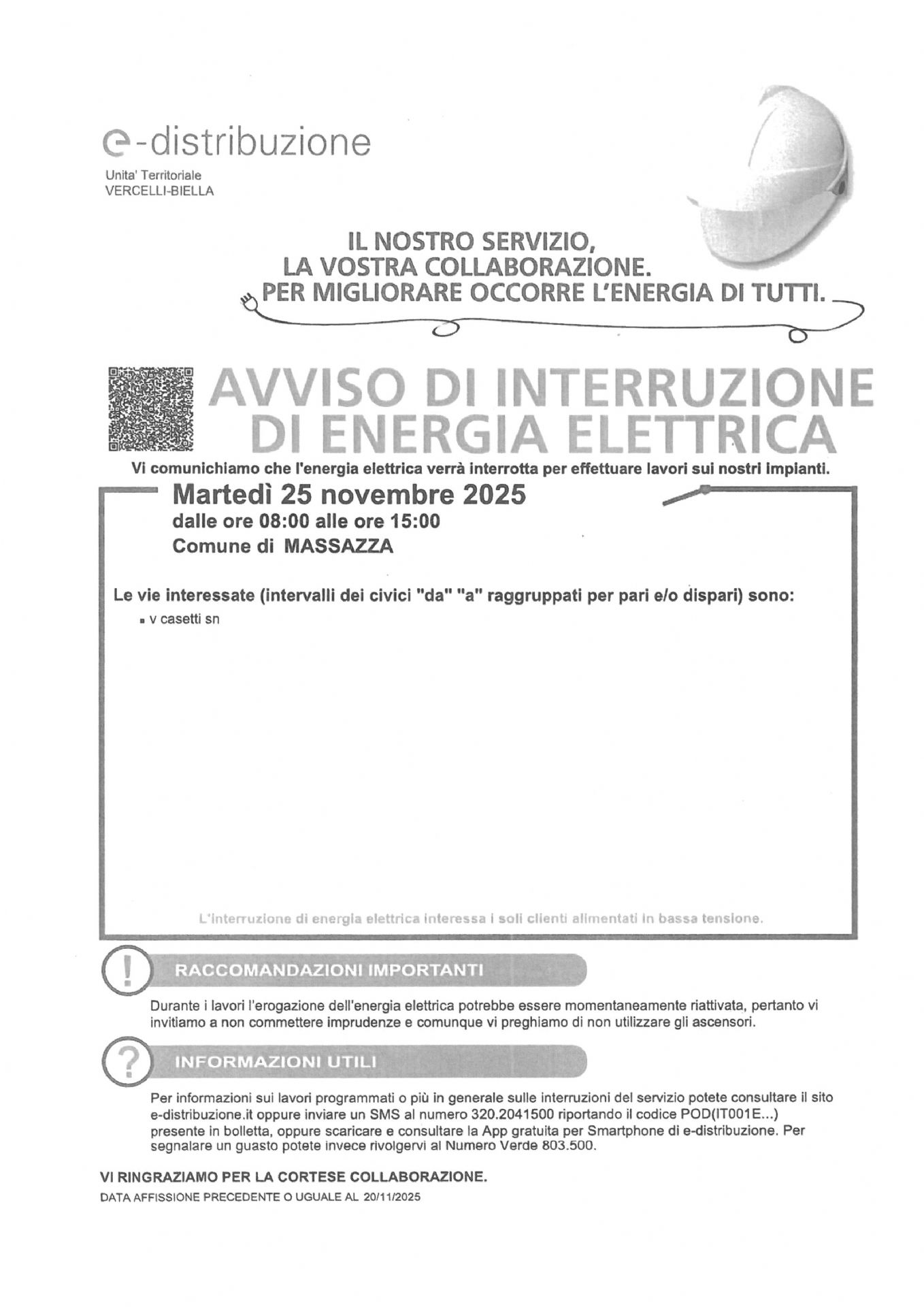 Si avvisano i cittadini che nella giornata di martedì 25 novembre 2025, dalle ore 8:00 alle ore 15:00, verrà interrotta l'energia elettrica, come da comunicazione allegata.